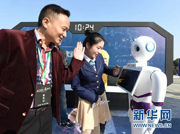 在安徽合肥开幕的科大讯飞(首届)全球1024开发者节展示区内,参观者和智能语音机器人进行互动(2017年10月24日摄)。新华社记者 郭晨 摄